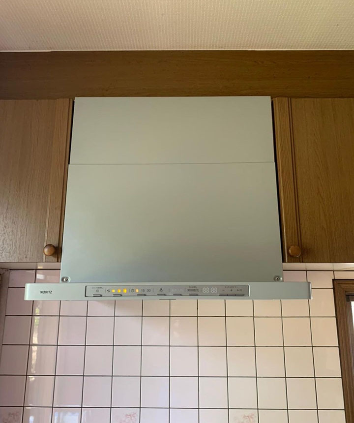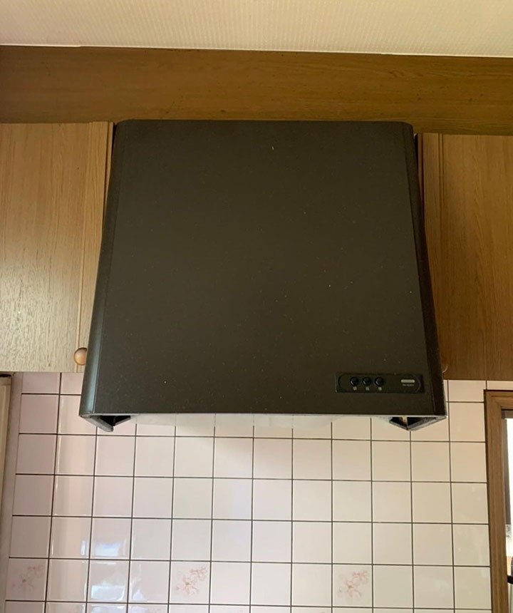 お客様より今まではフードタイプの物でしたがスリムタイプに交換したいとご相談をうけました。 スリムタイプのレンジフードを取り付けしました。